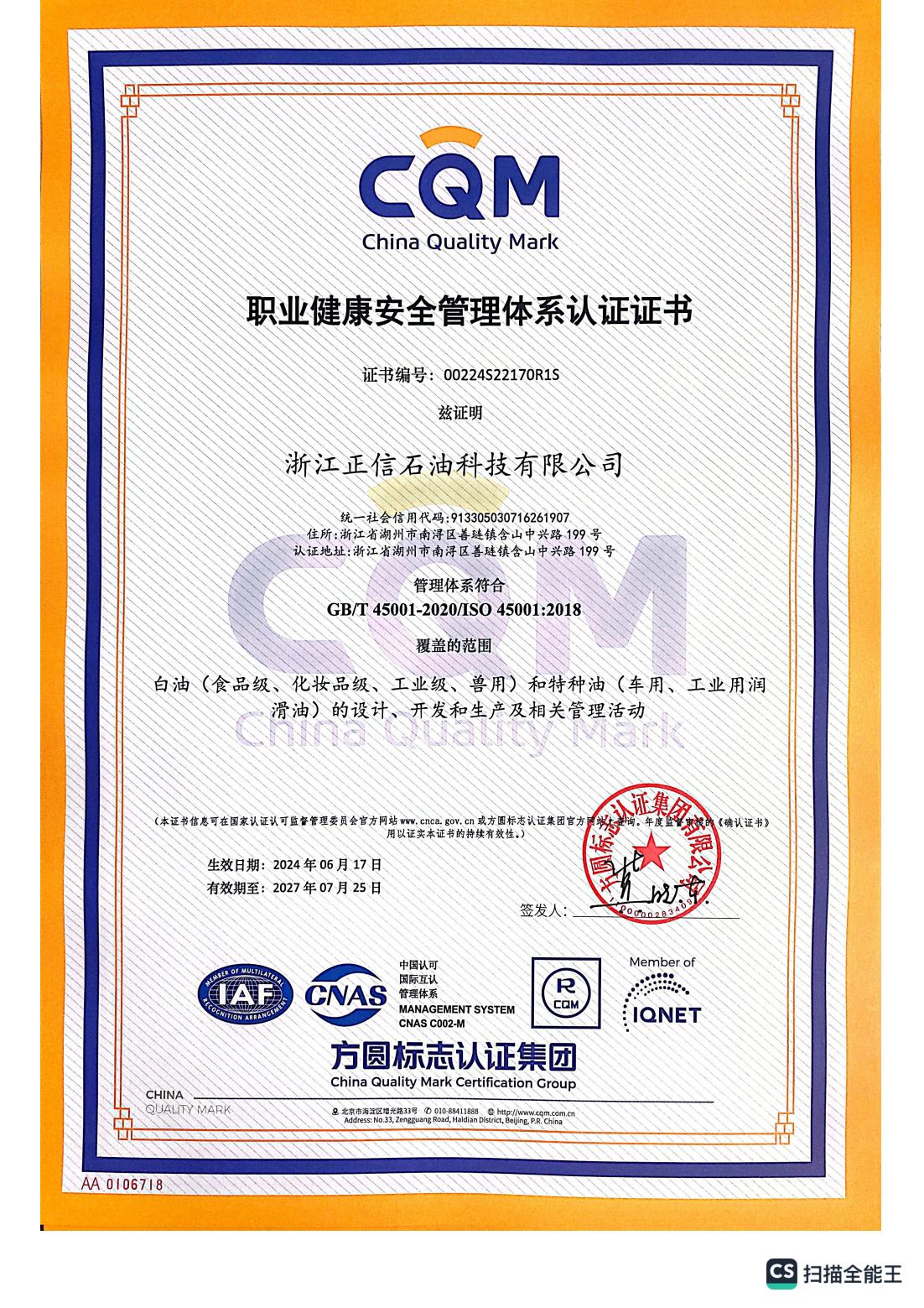公司坐落于湖州南浔-京杭大运河之畔,占地面积4.5万余平方米,年生产力达25万吨。公司为浙江省科技型企业,“汽车减振器油”、“化妆品级白油”浙江标准牵头(主要)编写单位,设有湖州市企业技术中心和CNAS国家认可白油实验室,拥有资深的产品研发专家、技术团队和管理精英,已获得多项技术专利;公司拥有智能的全自动DCS控制调和系统、先进的检测仪器设备、完善的生产工艺管理体系,已通过ISO9001质量管理、ISO14001环境管理、ISO45001职业健康安全管理、ISO50001能源管理等认证。公司是国内食品添加剂用白油指定生产企业之一,产品品质获得REACH、NSF、FDA、清真、犹太等多项权威认证。